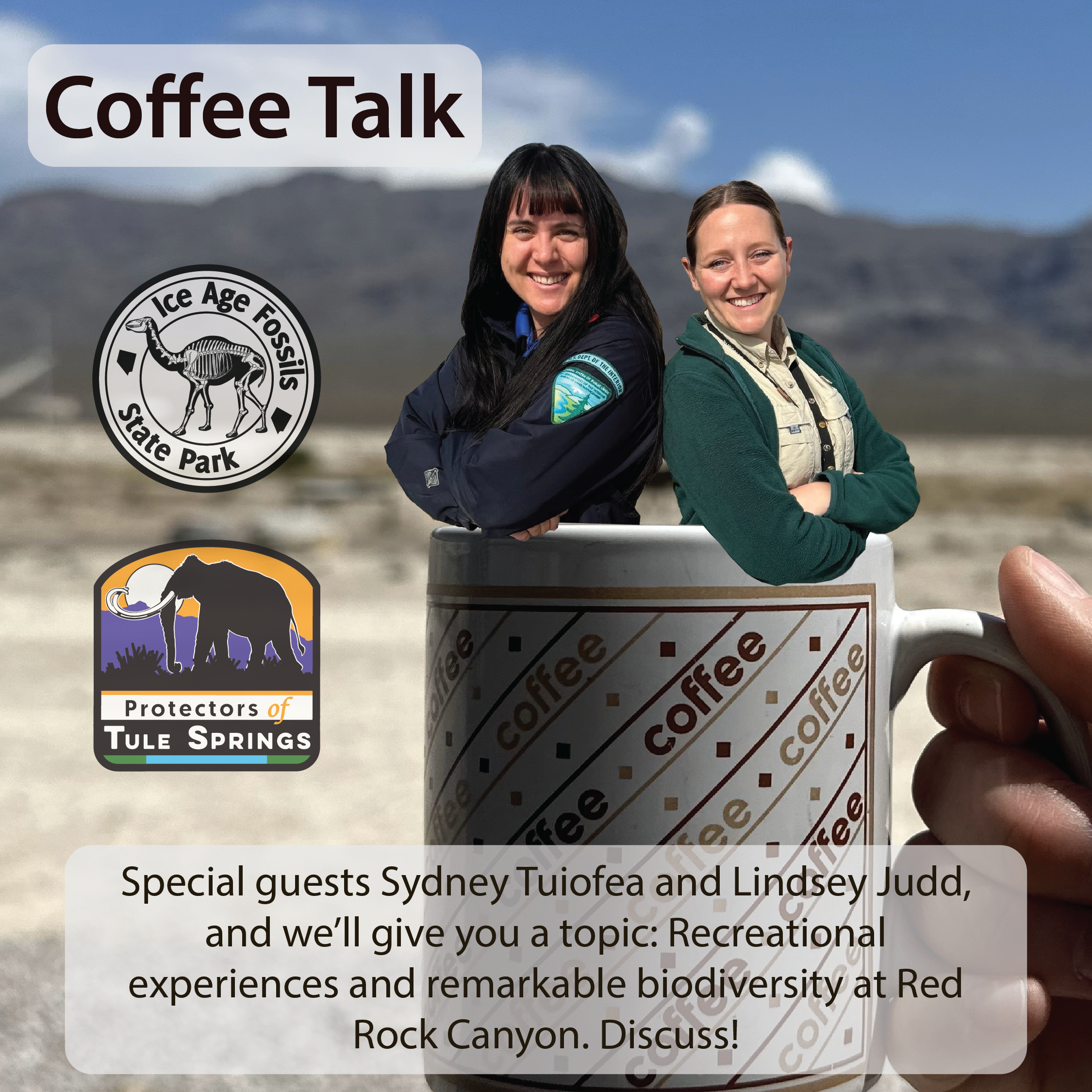 BYOM (Bring your own mug), come by, we’ll talk, no big whoop. Join us any time between 9:00 am – 11:00 am and talk amongst yourselves. You can ask questions about the park, talk to our special guests, share stories, geek out, and meet new people. We will have hot coffee, tea, and seasonal beverages to fill your mugs. Refreshments are sponsored by the park's non-profit partner, Protectors of Tule Springs. This program is geared towards adults, but kids are welcome.