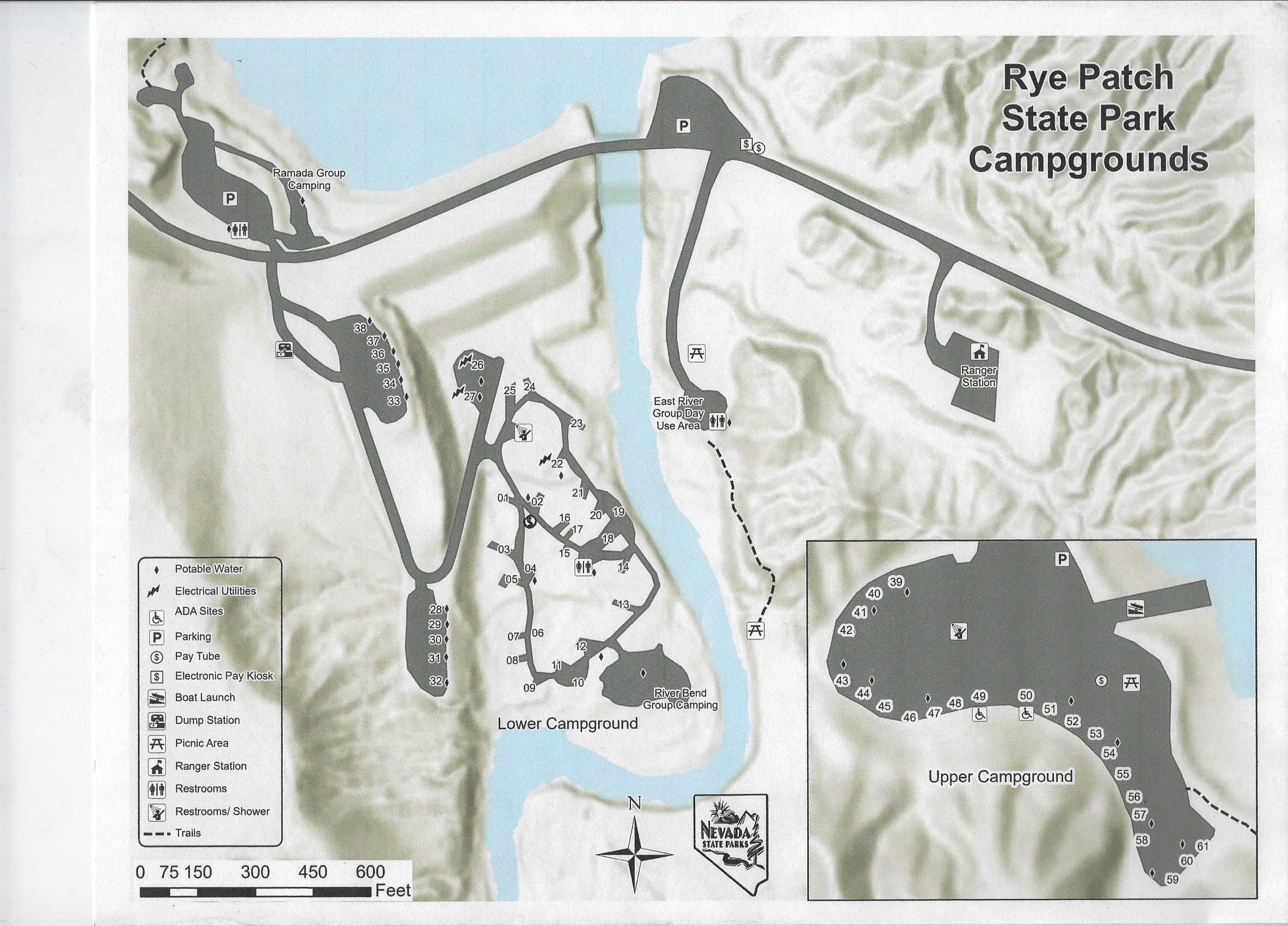 Camping: The river campground below Rye Patch Dam has 22 units, a restroom with flush toilets and hot showers. The campground on the reservoir's west side has 25 units, a restroom with flush toilets and hot showers. A sanitary dump station with potable water is located on the dam's west side. A camping limit of 14 days in a 30-day period is enforced. Campground Map